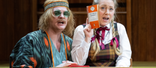 • A production shot of a man sat in a chair with his legs up whilst a semi clothed man dives backwards over his head